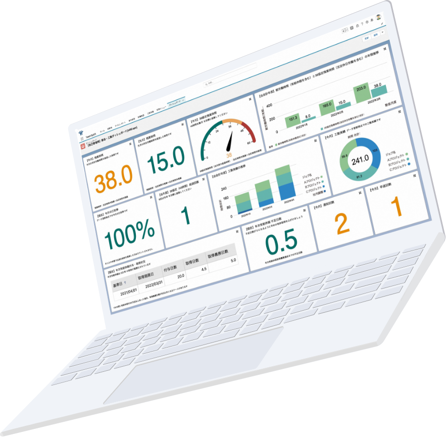 TeamSpirit 勤怠はリアルタイムに勤務時間を計算し、36協定の限度時間を超えそうな社員をレポートで表示させることが可能です。