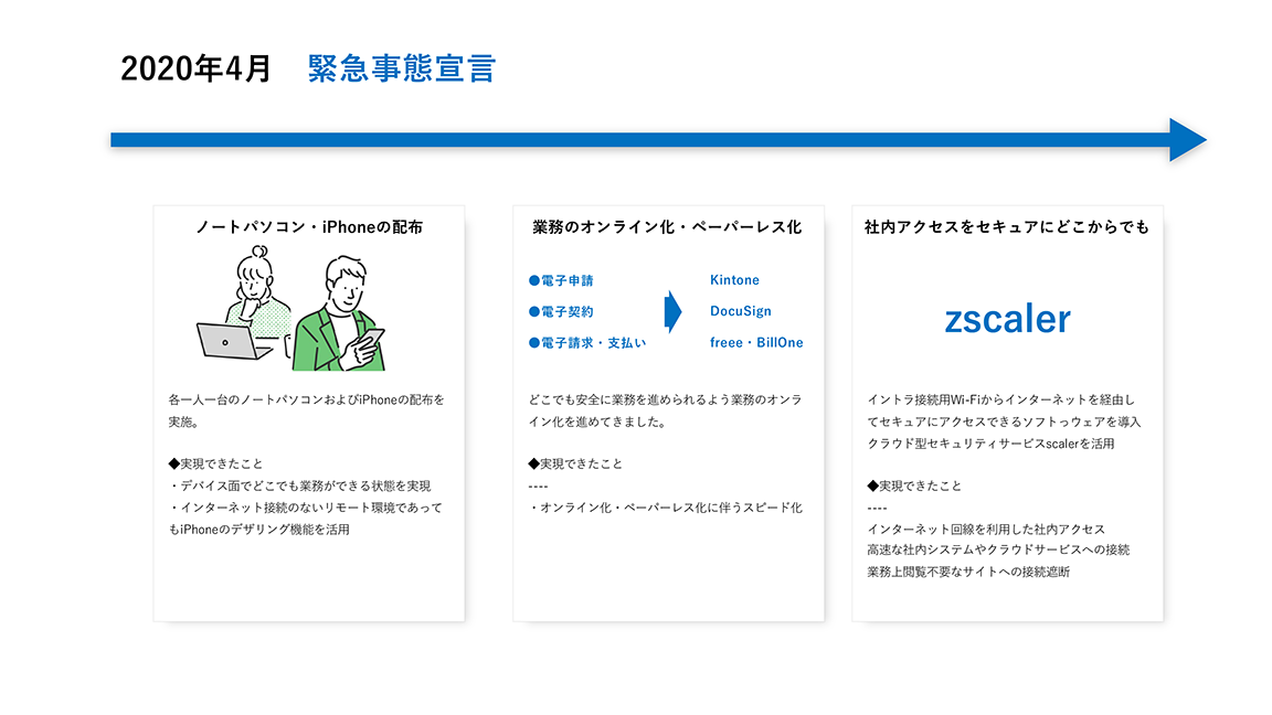 そこで同社ではテレワーク実現を機に、抜本的な働き方改革に着手。どこでも業務ができる状態を実現すべく、1人1台のノートパソコンおよびiPhoneを支給。さらに様々な業務をオンラインで完結できるよう、様々なクラウドツールの導入を進めていく。