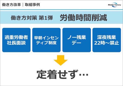 「2012年の取り組みでは、『労働時間削減』を掲げ、過重労働状態の社員と社長が直接面談する機会をもうけたり、早朝インセンティブ制度やノー残業デーの推進、22時以降の深夜残業の禁止をしました」と、小出氏。