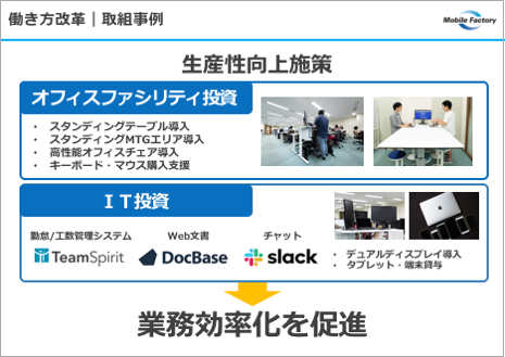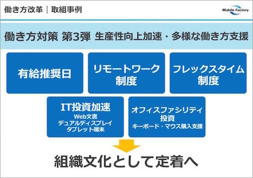 「特に、IT業界は競合企業がたくさんあり、エンジニアの争奪戦となっています。やはり大手の企業に優秀な人材が流れていくのですが、そこを何とか変えられるよう、宮嶌がエンジニアたちに直接話を聞き、『どうすればモバイルファクトリーで働き続けたいと感じるか』を吸い上げて、それを『働き方改革 第2弾』に反映しました。