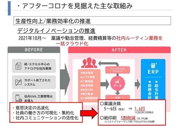 さらに抜本的な経営改革を行うために、働き方の見直しや組織・人員体制の再構築などにも取り組んでいく。いかに省力化を進め、収益構造を強固にするかという課題に対し、積極的なデジタル推進に取り組んでいったという。