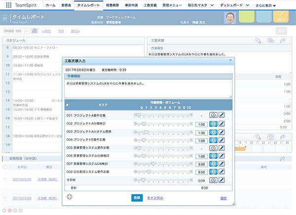 ボリュームスライダーによって、プロジェクトごとに工数を簡単に入力できる。このように勤怠管理で入力された工数データをそのまま使うことで、精度の高いプロジェクト管理が可能になる