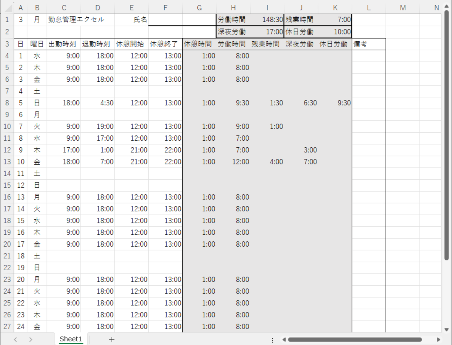 例えば以下の勤怠管理表では、C~F列に時刻を入力するだけで、G列~K列の数値が自動で算出されるようになっています。