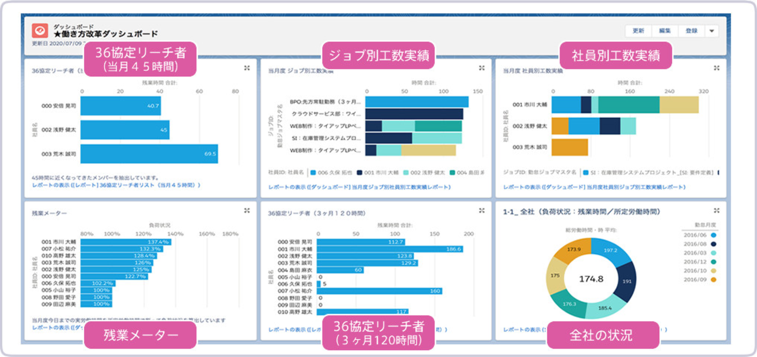 たとえばダッシュボード機能やレポート機能があるシステムなら「所定の残業時間をオーバーしていないか」「勤怠の締め状況がどうなっているか」などの確認も簡単です。「36協定リーチ者リストレポート」のような機能を搭載しているシステムであれば、当月の36協定対象の残業時間が40時間を超えたユーザのみを表示させ、40時間以上45時間未満の場合は黄色に、45時間を超えたら赤色で警告を表示できます。 労働基準法第36条の規定に抵触していないか簡単に確認できます。