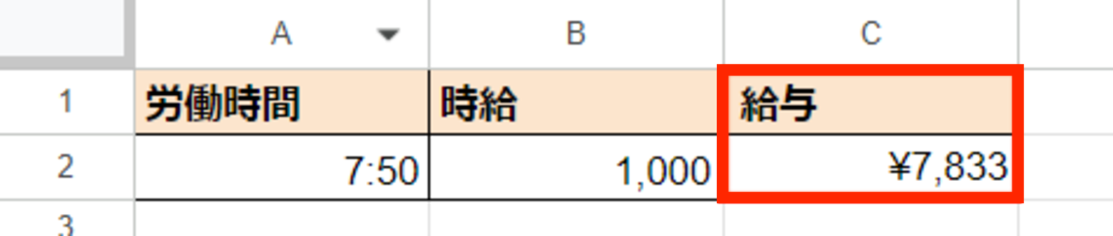 ①「労働時間」のセル(A2)に、「時間:分」の形式で、給与計算したい期間の合計労働時間を入力する(上記の例では7時間50分なので「7:50」と入力)