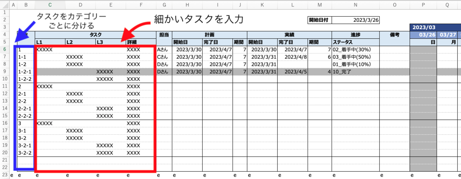 まずは大まかなタスクを洗い出し、B列に入力しましょう。その後C〜E列に細かいタスクを記載していきます。タスクを出し切ったら、タスクごとの担当者をG列に記載します。