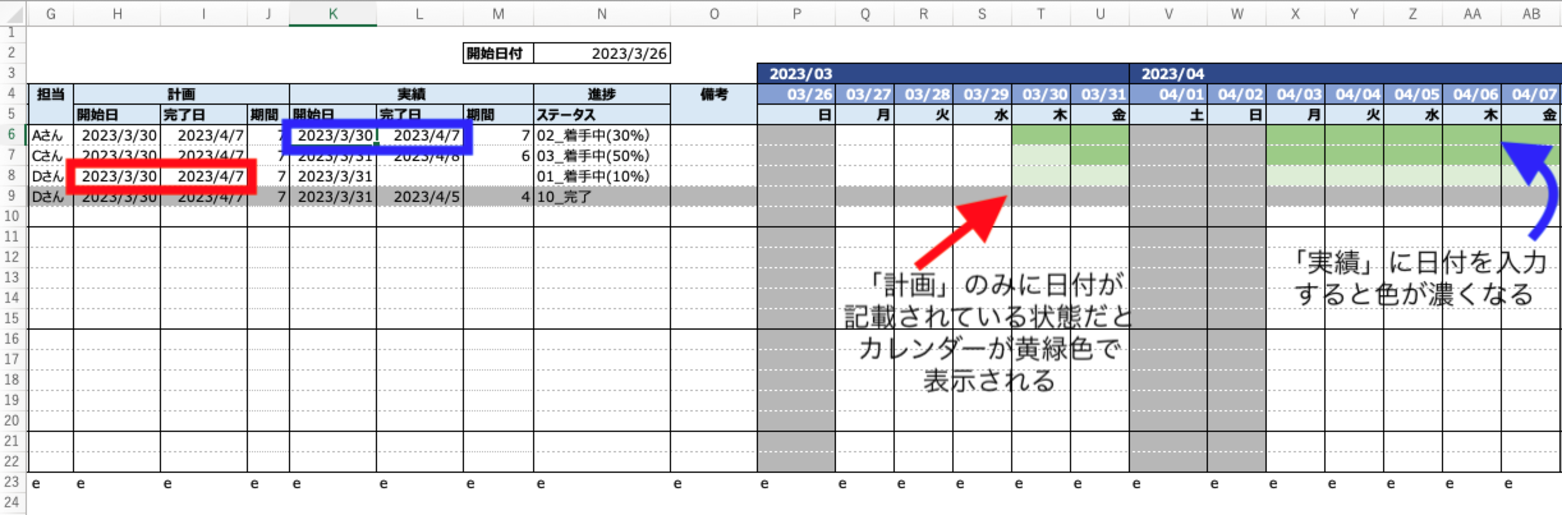 すべてのタスクに担当者をアサインしたら、タスクごとの計画(開始予定日と完了予定日)を、「計画」のカテゴリー内(H列とI列)に入力していきます。ここで入力した日付はカレンダー上で薄い黄緑色(赤矢印の部分)に色付けされるため、ひと目でプロジェクトのスケジュールが分かるようになっています。