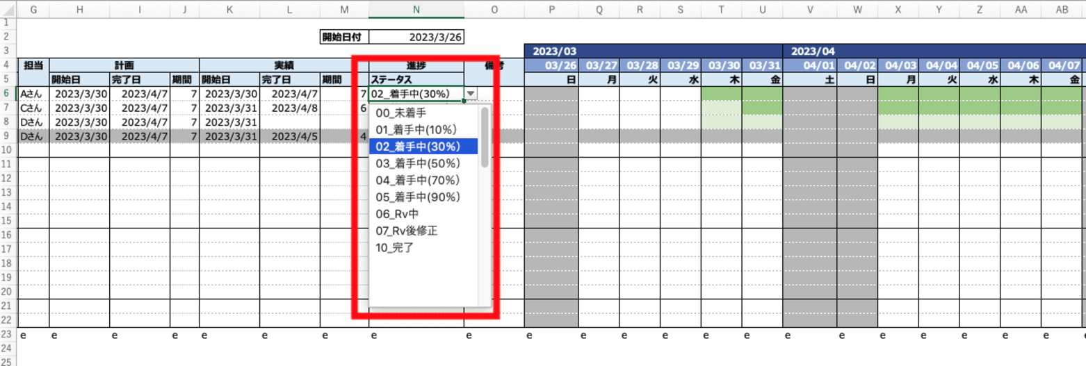 ドロップダウンリスト(プルダウン)形式で簡単に進捗状況を選べるようになっており、「完了」を選ぶと背景がグレーに変わります。進捗状況が可視化されることで、プロジェクト全体を俯瞰しやすくなるでしょう。