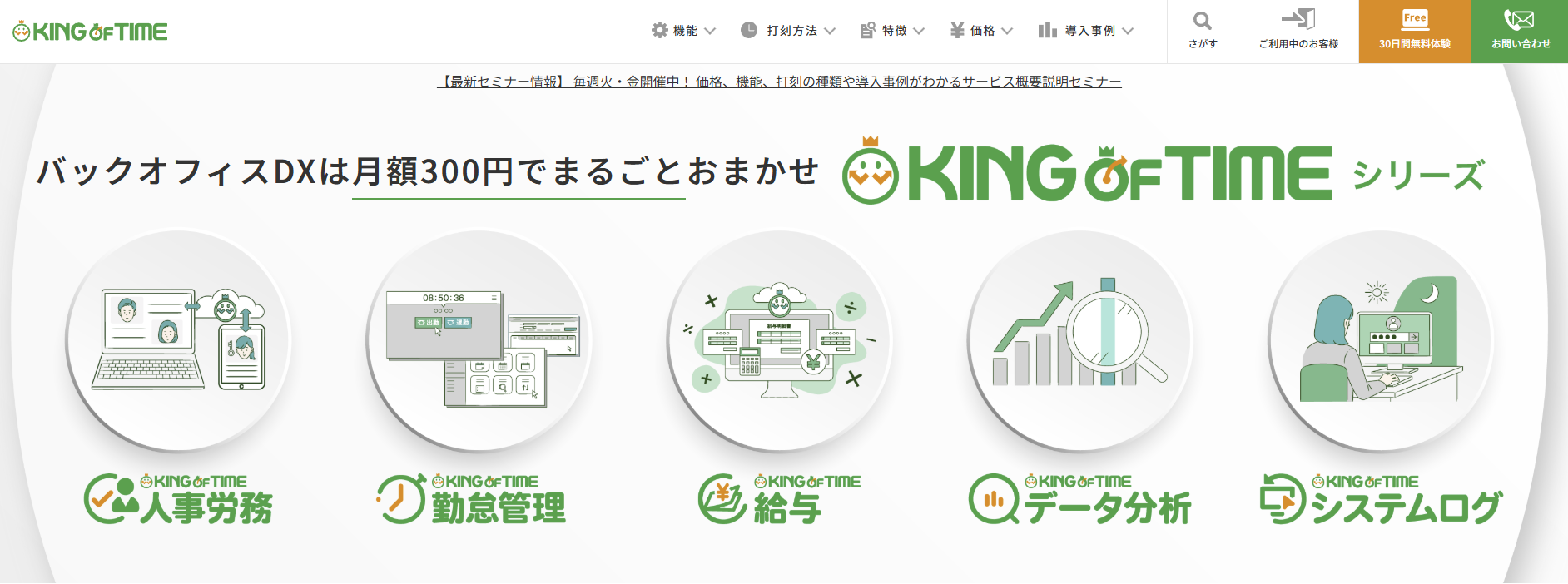 「KING OF TIME」は勤怠管理システム業界でNo.1の打刻種類の多さを誇るサービスです。パソコンやスマホからはもちろん、顔認証や指紋認証、ICカードからなど、機能別にさまざまなシチュエーションを想定した使い方ができます。