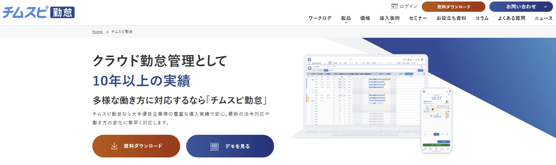 「チムスピ勤怠」は株式会社チームスピリットが提供する勤怠管理システムです。チームスピリットシリーズは、契約社数が2,000社以上、かつ大手優良企業への豊富な導入実績もあり、信頼できるサービスといえます。