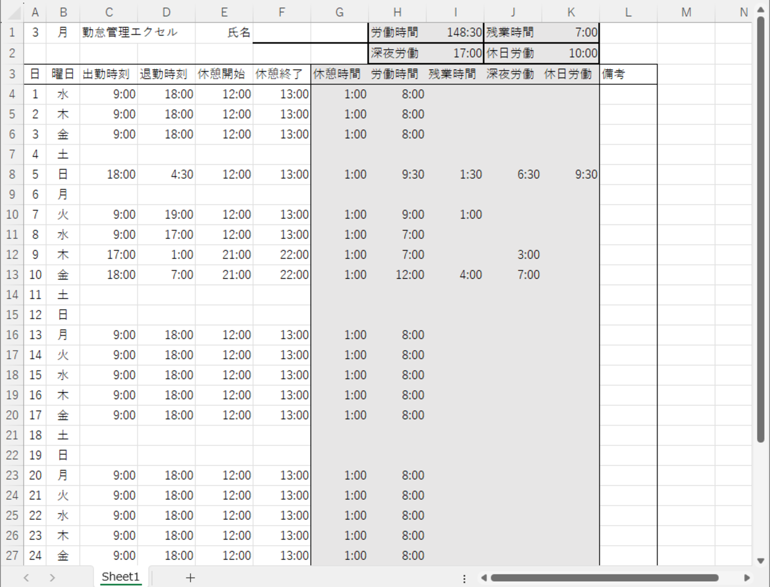 上記のエクセルファイルでは、出勤/退勤時刻と休憩開始/終了時刻を入力すると、自動的に残業時間を算出・集計できるように関数式が組まれています。I列に日々の残業時間が記録され、その月の残業時間の合計がK1セルに表示されるのです。