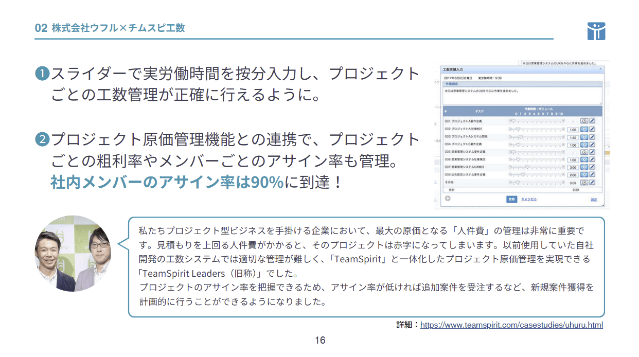 チームスピリットが提供する「プロジェクト原価管理(旧:TeamSpirit Leaders)」を導入して、煩わしい作業なくリソース管理が可能となった、株式会社ウフルの事例を紹介します。