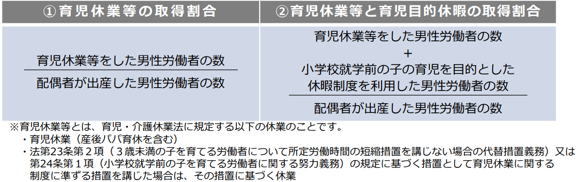 次の①または②のいずれかの割合を公表する ①育児休業等の取得割合 ②育児休業等と育児目的休暇の取得割合 |