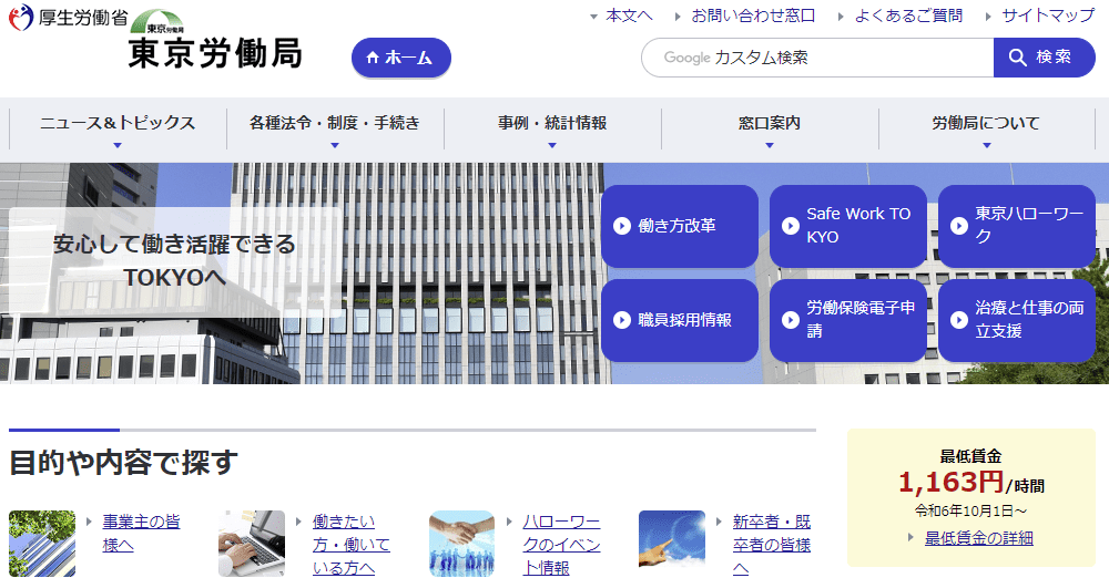 労働局は都道府県ごとにあるので東京都にある会社だと、「東京都労働局」と検索しアクセスします。労働局のトップページには共通して「事業主の皆様へ」というリンクや直近の法改正を案内するリンクがあります。