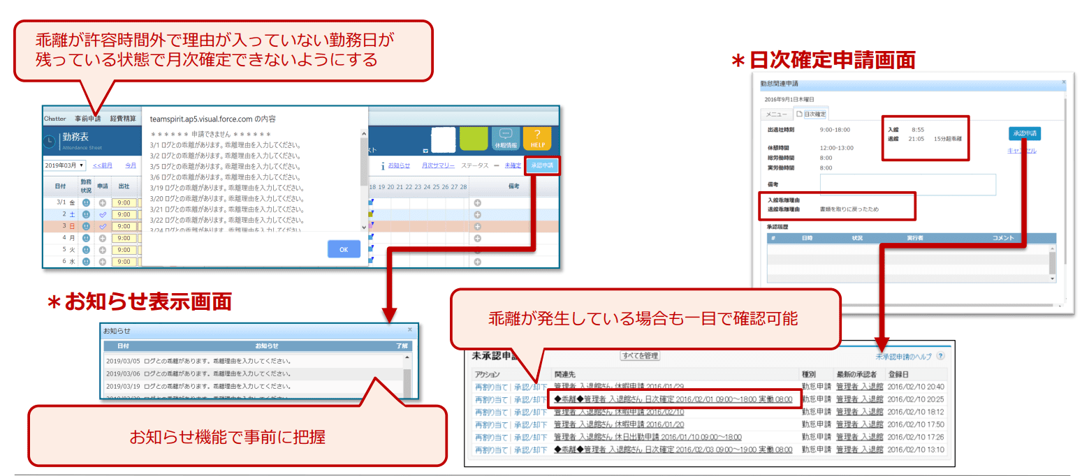 - 打刻情報とPCログの情報に乖離があった場合、乖離理由の申請や承認が行える