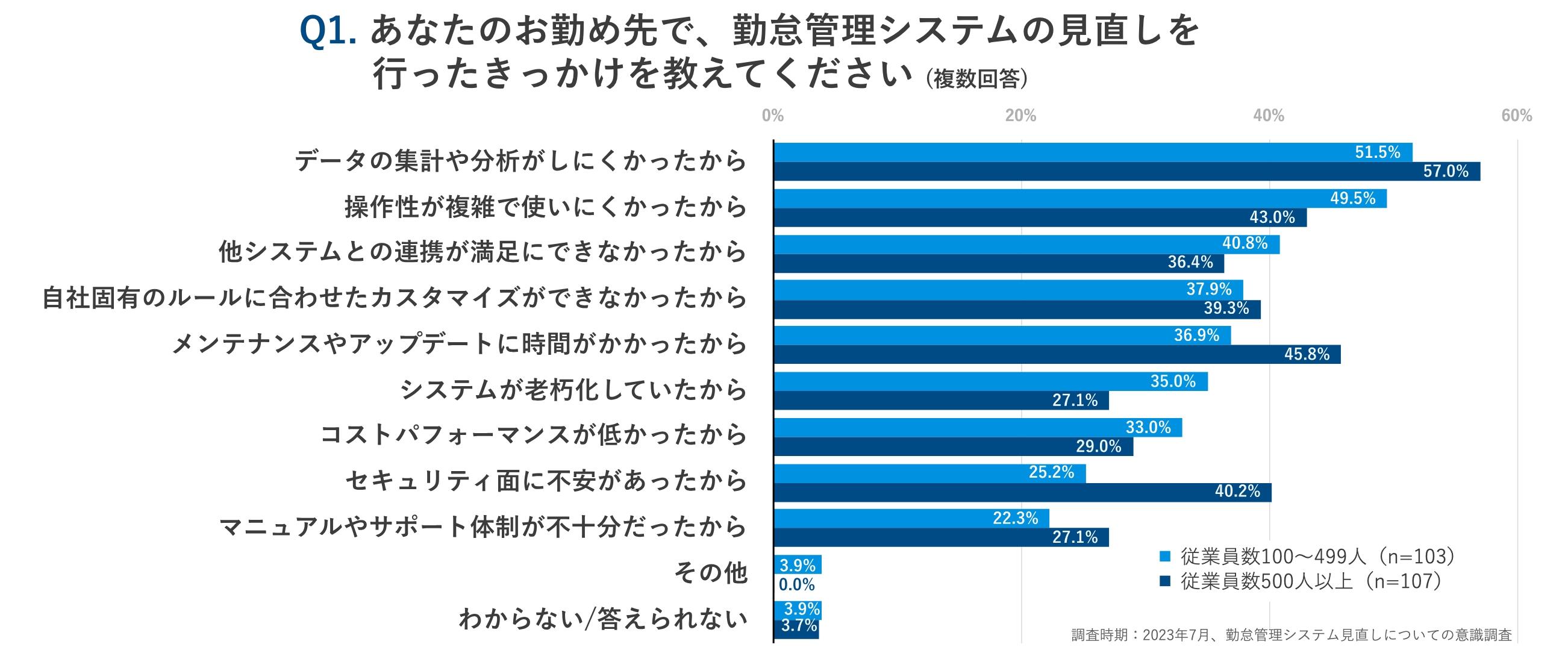 人事労務担当者210名を対象に弊社が調査した「勤怠管理システム見直しについての意識調査」では、勤怠管理システムの見直しを行うきっかけとして、「データの集計や分析がしにくい」「操作性が複雑で使いにくかった」「マニュアルやサポート体制が不十分だった」といった理由が挙げられていました。