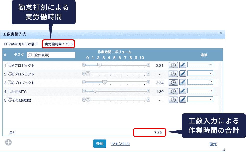 勤怠管理システムと工数管理システムを掛け合わせたプラン「チムスピMix」では、「実労働時間」と「工数実績の合計時間」を簡単に完全一致させることができます。