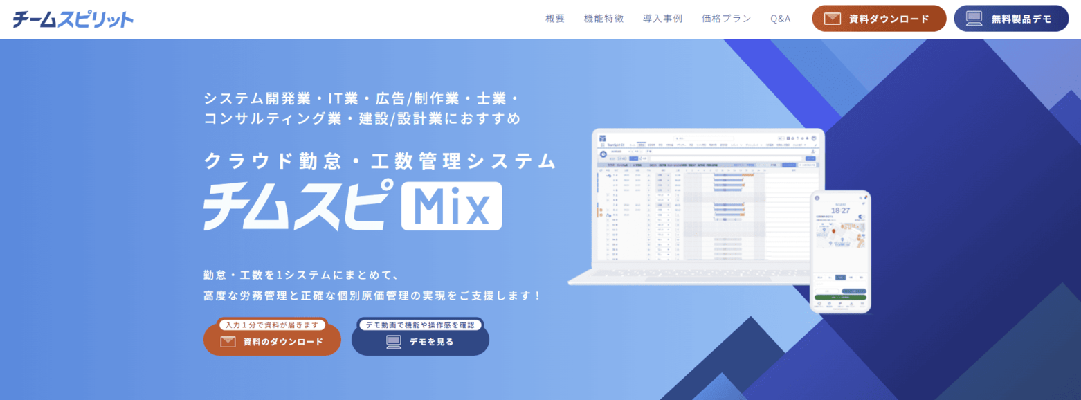 1つのシステムで勤怠と工数を一元管理するなら「チムスピMix」!