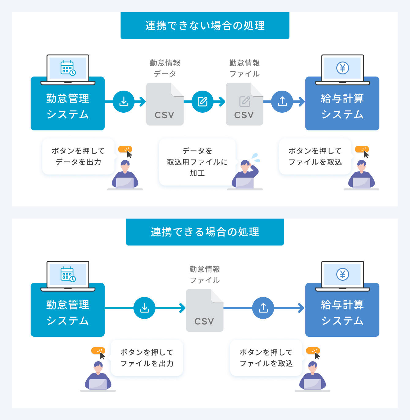例えば「勤怠管理システム」を新たに導入する場合、給与計算システムと連携ができないと、「勤怠管理システムで取得した情報を確認して、それを手入力で給与計算システムに打ち込む」という作業が必要になり、非効率です。