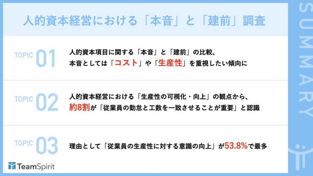 お知らせ【人的資本経営、大企業経営者の「本音」とは?】 「生産性の可視化・向上」の観点から、 約8割が「従業員の勤怠と工数の一致」の重要性を認識