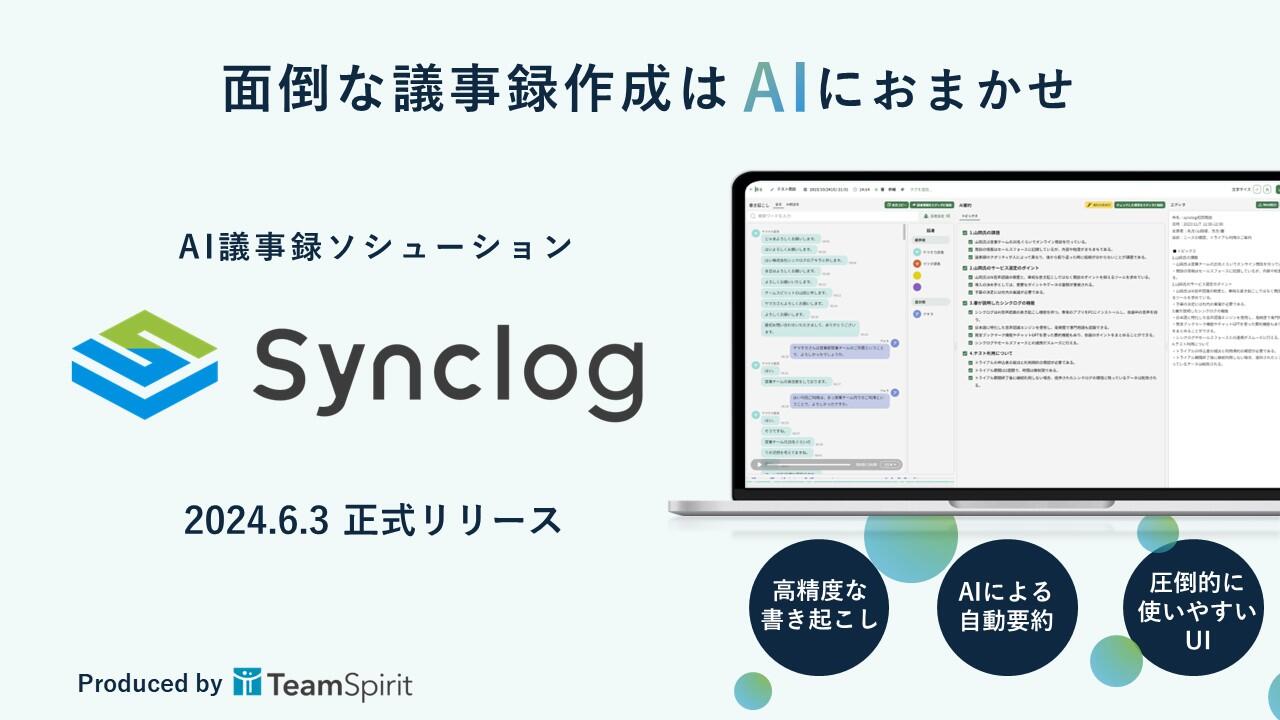 お知らせチームスピリット、議事録作成を劇的に効率化するAI議事録ソリューション「Synclog」を正式リリース
