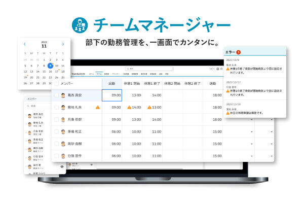 - 打刻状況の把握や、マネージャーによる勤務情報の代理修正も可能。