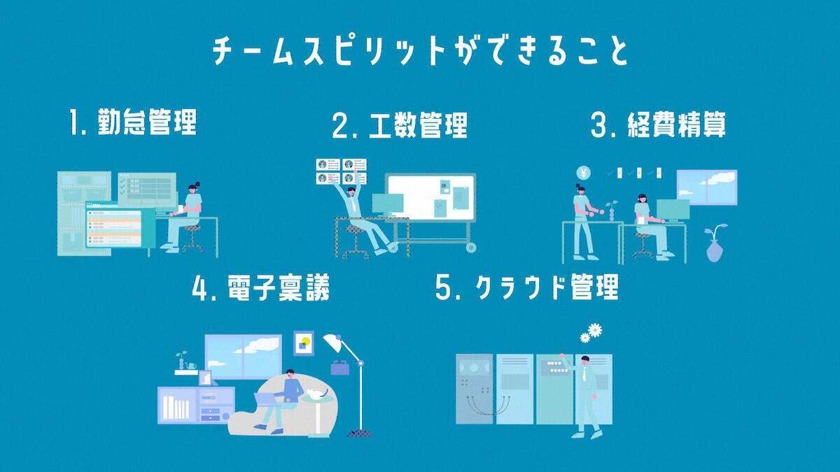 TeamSpiritの特徴や利点をコンパクトにまとめました。各機能で解決可能な業務のお悩みを分かりやすい動画でご紹介します。