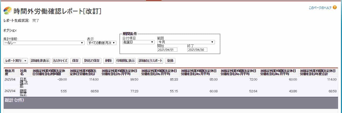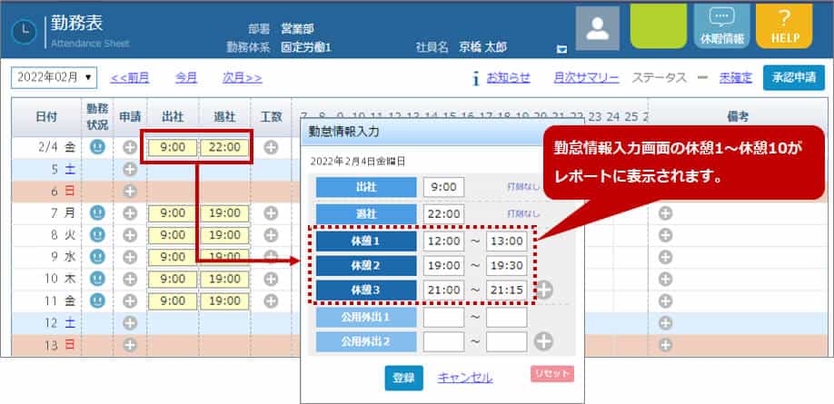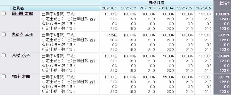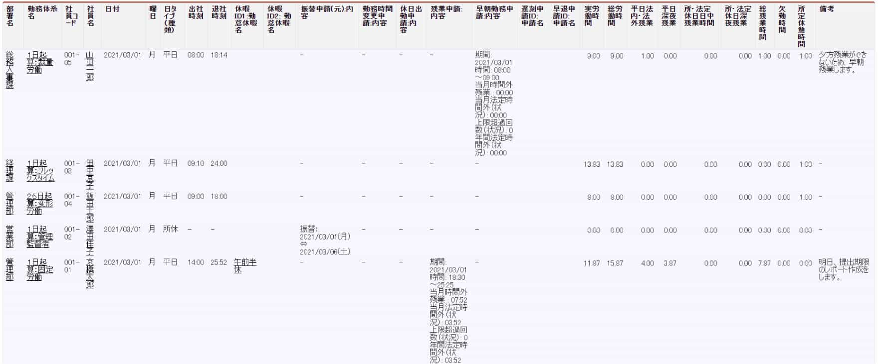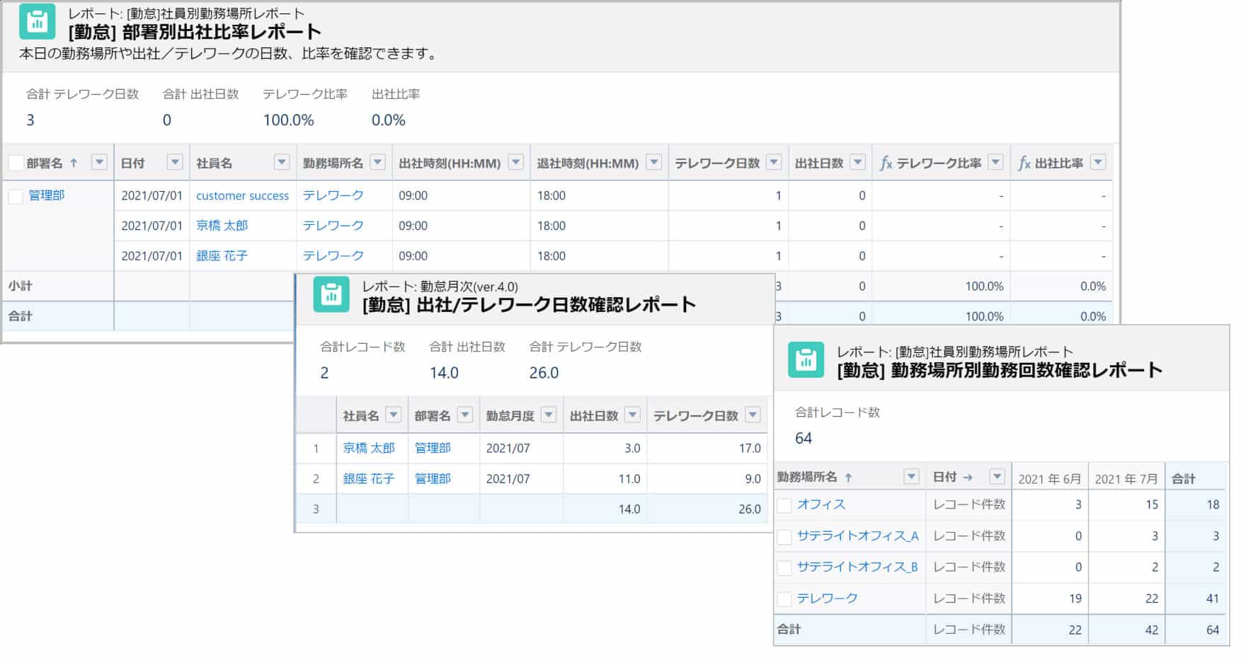 スタッフ別の残業状況把握や出勤場所の一覧化など、マネジメントに役立つレポートが充実。またスタッフへの自覚を促すレポートは、マネジメント工数の圧縮にもつながります。